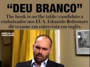 Dudu Bolsonaro tentou a todo custo ser indicado para a Embaixada nos EUA. Para isso está tomando aulas de inglês (parece que os tempos de hambúrguer não foram suficientes) e, por ordem de Ernesto Araújo (ministro de Relações Exteriores) secretários e embaixadores estão dando aula para o zero três aprender a se comportar e talvez não falar “caralho, deu branco” em entrevista.