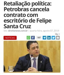 A direção da Petrobrás cancelou, unilateralmente, no dia 6, contrato que mantinha com o escritório do presidente da OAB, Felipe Santa Cruz. O escritório defendia a companhia em causas trabalhistas. Recentemente, Santa Cruz foi alvo de mais um pronunciamento desrespeitoso de Jair Bolsonaro, em relação a seu pai, morto pela ditadura. Como nunca antes, a Petrobrás está sendo usada para atacar opositores de Bolsonaro.