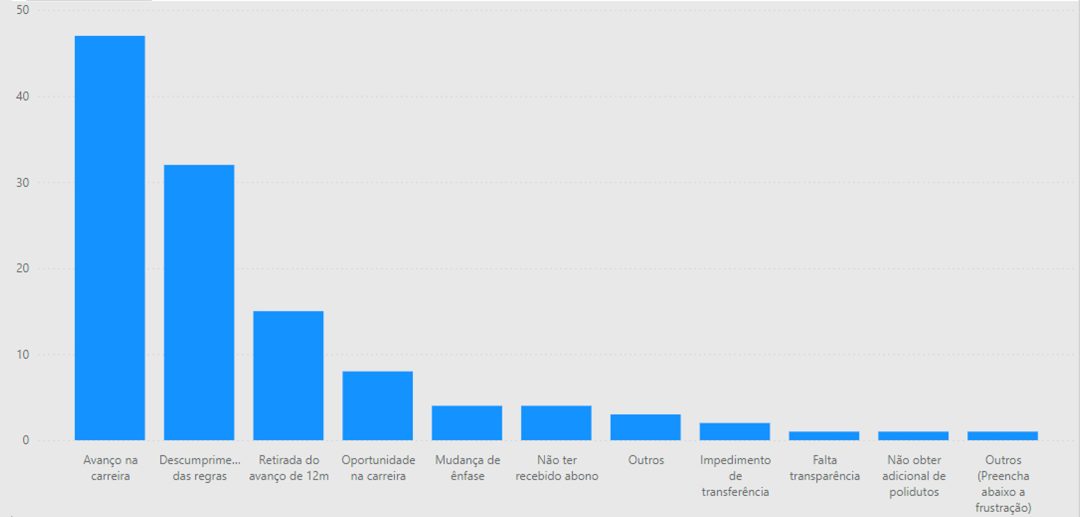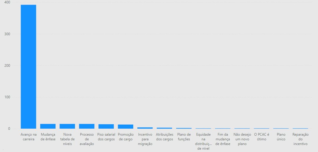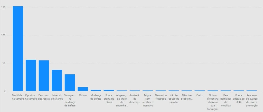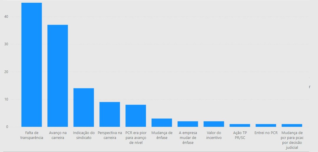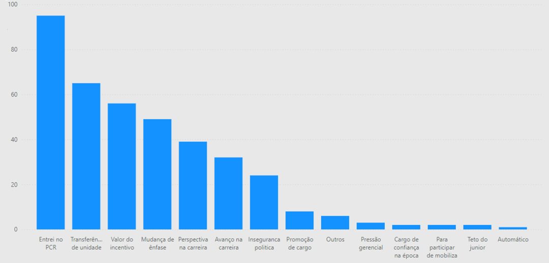 A pesquisa levanta algumas perguntas para compreender melhor os motivos que levaram os entrevistados a tomar decisões sobre o Plano, seja migrar para o PCR, como também ficar no PCAC. Para os que ficaram no PCAC, o principal motivo para a decisão foi a falta de transparência sobre os impactos da mudança e a vontade de avanço na carreira. O gráfico a seguir levanta o resto dos motivos: