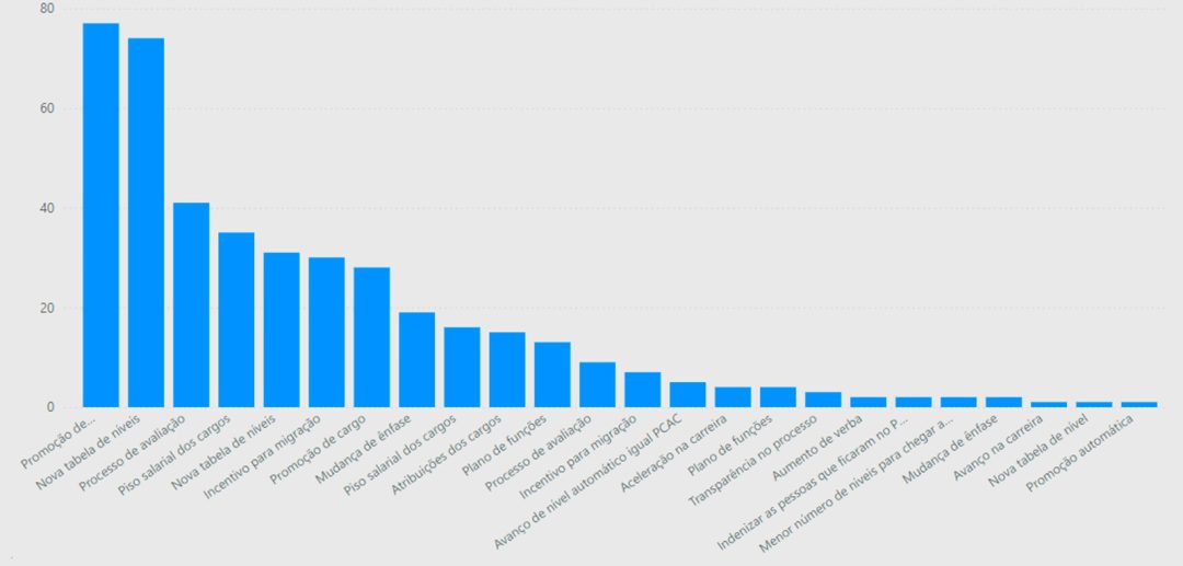 No caso da prioridade número dois, as duas resposta mais encontradas foram promoção de cargos e nova tabela de níveis, ficando o quadro configurado da seguinte forma: